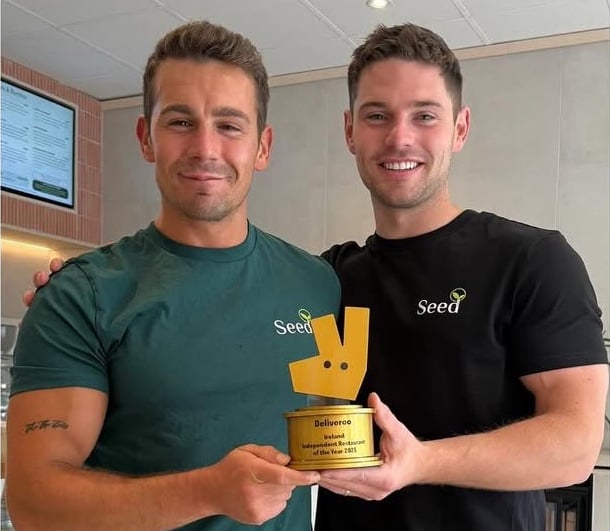 Yes, Stevie is a chef, and a brilliant chef. He is also a partner and head chef at Seed Salads, the NI based restaurant business that sells the healthiest fast food I have ever eaten. The photo below shows Stevie (left) and his business partner Peter with Seed’s recent award of Deliveroo Ireland Independent Restaurant of the Year for 2025.